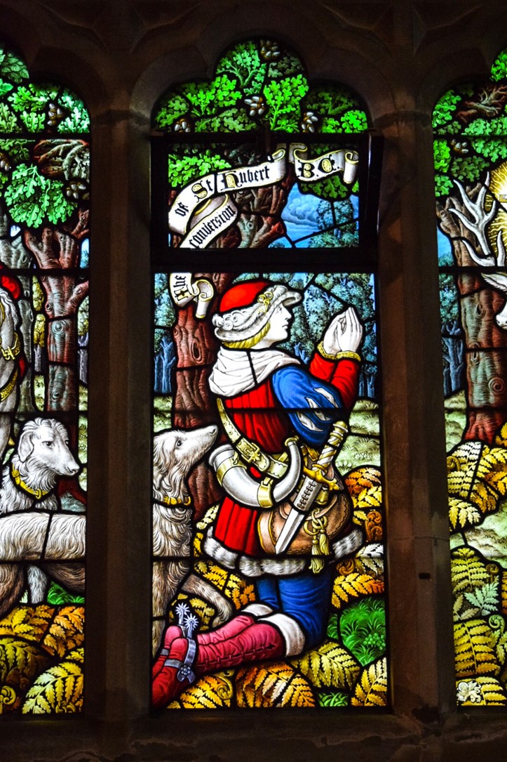 A detail from the side chapel window dedicated to St Hubert and by Alexander Gascoyne.