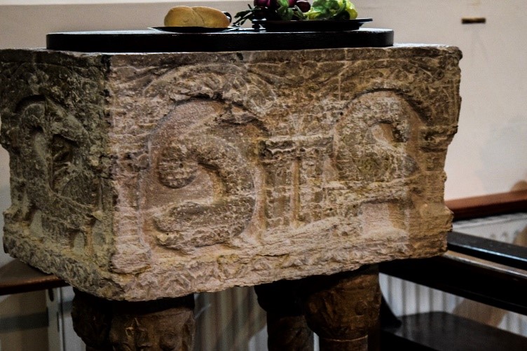 In 1901, the prefabricated structure was replaced by the present stone building, designed by Edmund Kirby, a pupil of Pugin’s oldest son Edward. The church is in an adaptation of the Early English style, built in red and white Hollington sandstone with a timber bellcote at the west end. While the building is relatively small, it is coherent in its design and is little altered. It has a distinctive heavy scissor-trussed roof and the interior fittings are of high quality. These include a font in a late twelfth century Romanesque style whose provenance is uncertain. It was most likely found next to the River Mease, but another source says it was imported from Treviso. Whatever its origin, it was probably not designed as a font as it portrays no obvious Christian symbols.