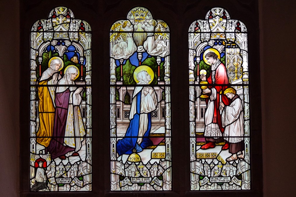 Unusually, the central window on the north side is in memory of Father John O’Toole, an early pastor of the church and includes representations of items still in use today including church plate and the Sanctus bell. The window was designed by W. J. Wainwright, President of the Birmingham Society of Artists for Hardmans. Father O’Toole is pictured in the lower portion of the window alongside representations of the sisters of St Joseph of Bordeaux who had a strong and distinctive presence in Haunton from 1904 to 2017. The most recent window is in the chancel and commemorates Oswald de Trafford who died in 1942 and is also by Hardman.